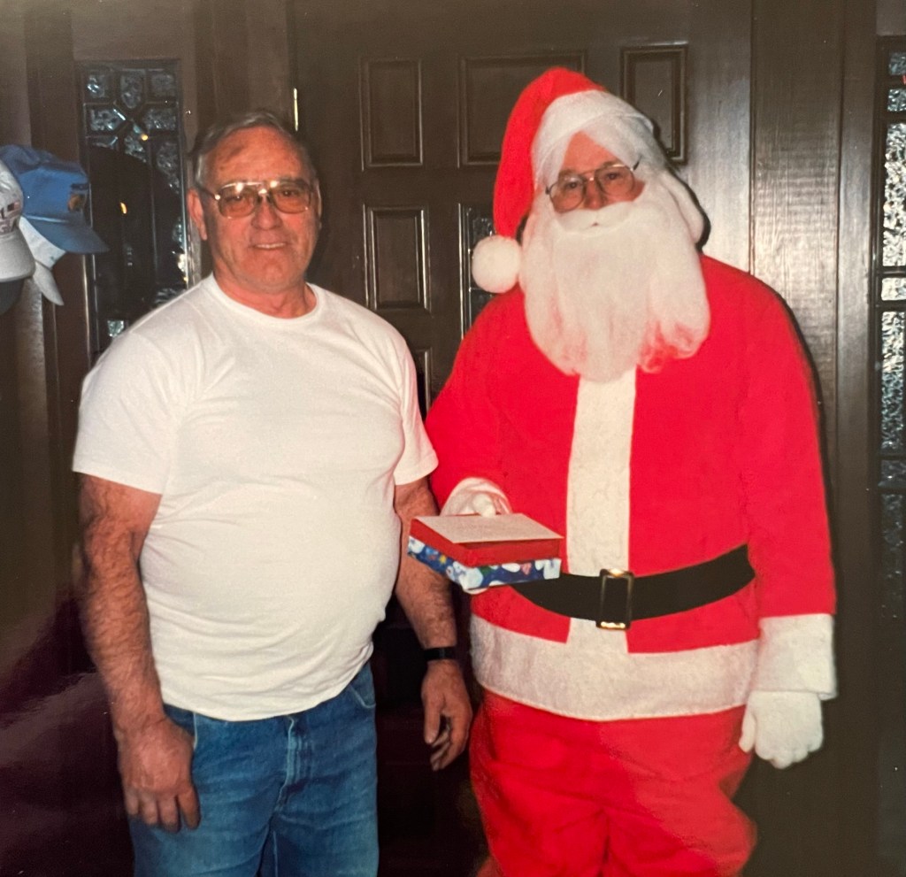 Ed, playing Santa, delivering a Christmas present to my Dad
